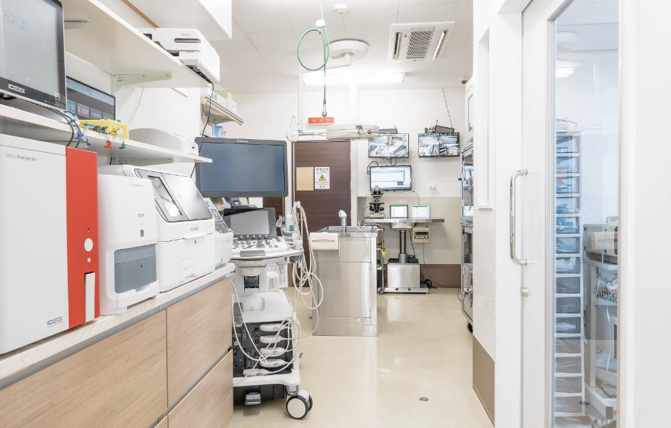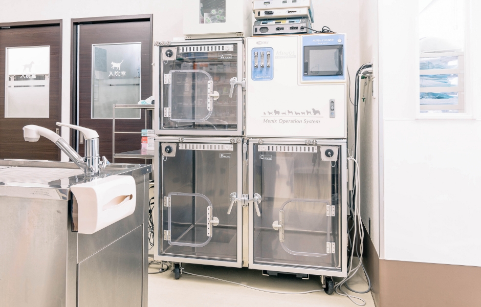 麻酔を用いた処置(手術前の毛刈り、歯石除去等)も行うため、麻酔器、生体情報モニターも完備しており